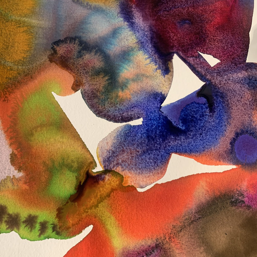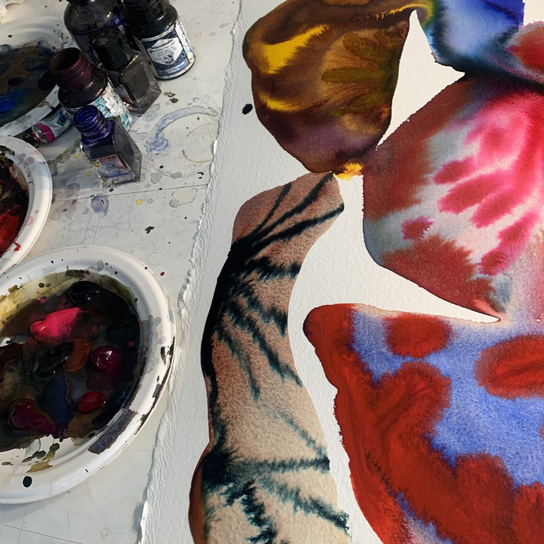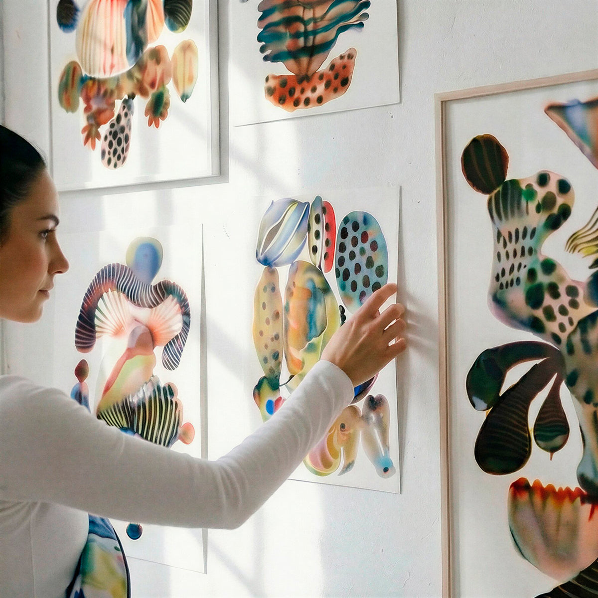 Le matériau principal est imprimé à l'aide d'un procédé de sublimation haute résolution conçu par Emma Larsson, qui vit et travaille à Stockholm (Suède) et est une artiste contemporaine travaillant principalement à l'aquarelle. Ses compositions biomorphiques oscillent entre abstraction et figuration, évoquant des structures organiques, des formes cellulaires et des organismes imaginaires. Grâce à des dégradés richement pigmentés et à un mouvement contrôlé de l'eau, elle développe des formes hybrides dans lesquelles des transitions douces rencontrent des éléments graphiques tels que des rayures et des points. Les œuvres se dressent de manière indépendante dans un espace ouvert, déployant leur impact grâce à la tension entre la couleur fluide et la structure définie.